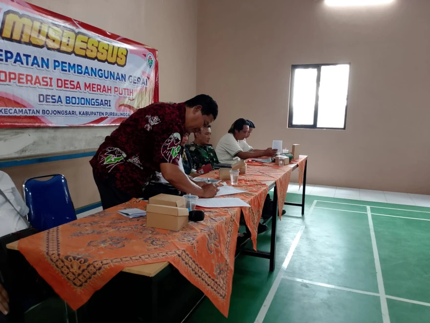 Bojongsari, 26 November 2025 Pemerintah Desa Bojongsari menggelar Musyawarah Desa Khusus (MUSDESUS) dengan agenda utama percepatan pembangunan Gerai Koperasi Desa Merah Putih, khususnya terkait penetapan lahan tanah kas desa yang akan digunakan sebagai lokasi pembangunan gerai tersebut. Kegiatan ini dilaksanakan di Balai Desa Bojongsari dan dipimpin langsung oleh Ketua BPD Bojongsari, Bapak Suwandi.